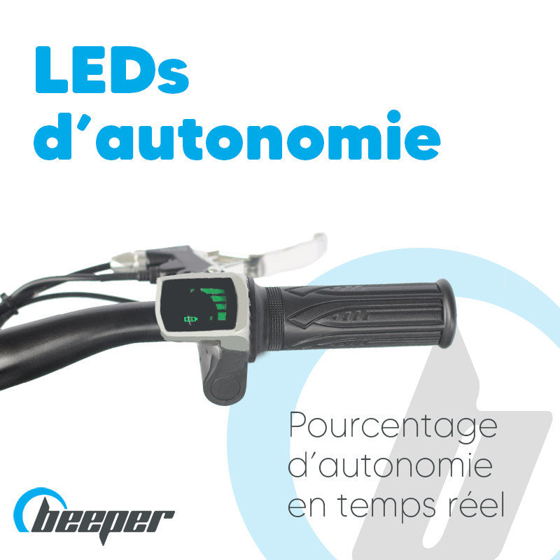 La moto BEEPER KID TRAIL est composé d’une batterie plomb 36V 12Ah pour vous proposer une autonomie jusqu’à 25 km soit environ 55 min selon l’utilisation.