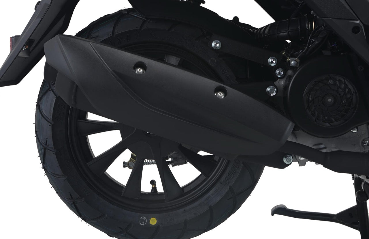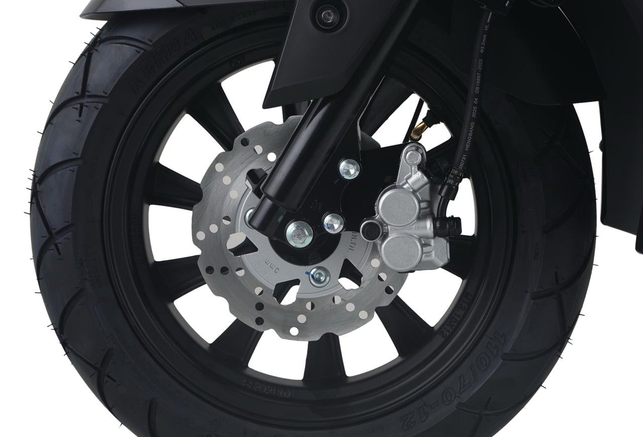 Pensé pour la praticité, il dispose d’un double démarrage kick et électrique, d’une alimentation par injection, ainsi que d’un réservoir de 5 litres, parfaitement adapté aux trajets quotidiens. Côté sécurité, le freinage combine un disque à l’avant et un tambour à l’arrière, garantissant un bon équilibre entre efficacité et confort de conduite.
